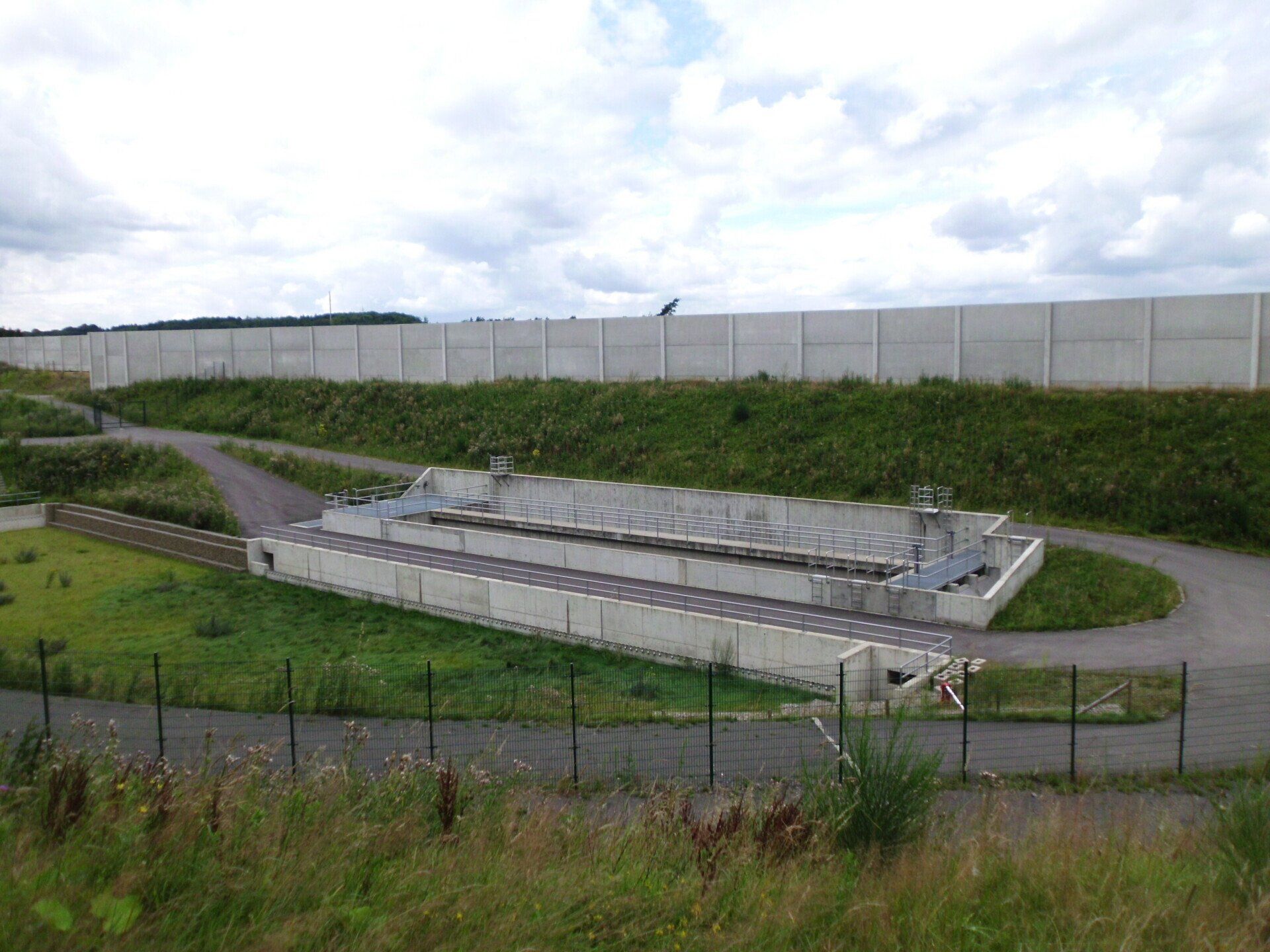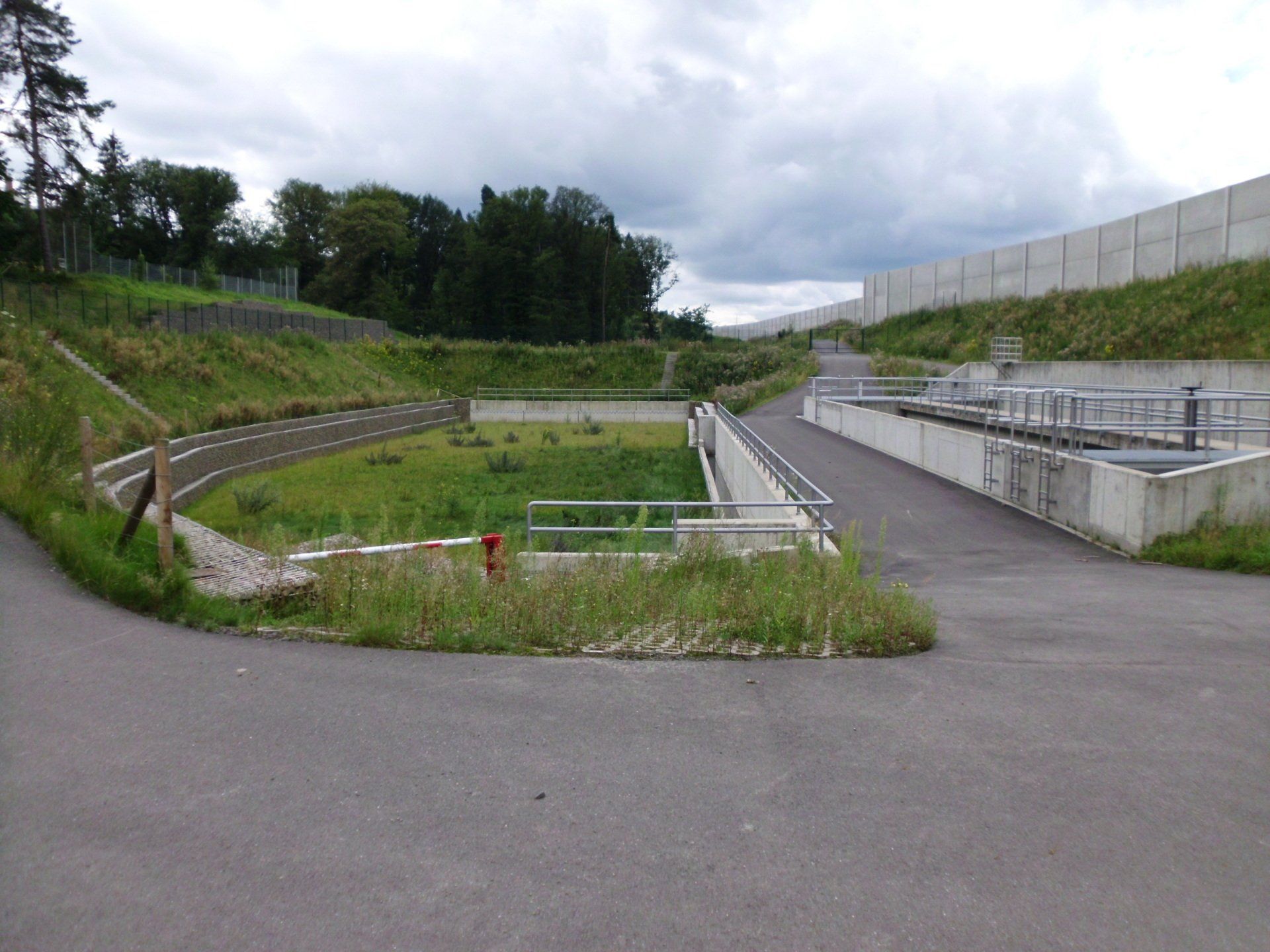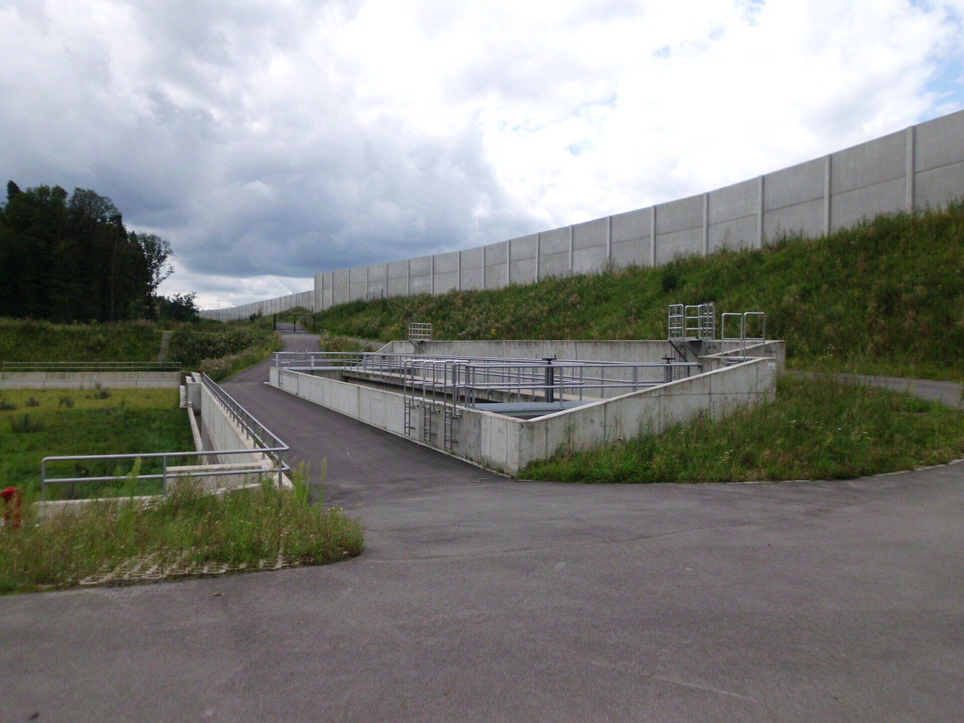 Entscheidungsgründe für die Auswahl der Ausführungsvariante waren z.B. der erforderliche Platzbedarf für die Kombinationsanlage, die Möglichkeit zur Reinigung einer Beckenkammer bei ungehindertem Betrieb der zweiten Kammer, die Minimierung von Außenwänden, Trenn- und Vereinigungsbauwerken sowie Notentlastungsanlagen. Die SALbesteht aus einem Stahlbetonabscheider (RiStWag) und einem Bodenretentionsfilterbecken (BFB) als Erdbecken. Die gesamte Anlage wird durch umlaufende Wartungswege über eine zentrale Zufahrt vom aufgeweiteten Standstreifen der BAB aus erschlossen.