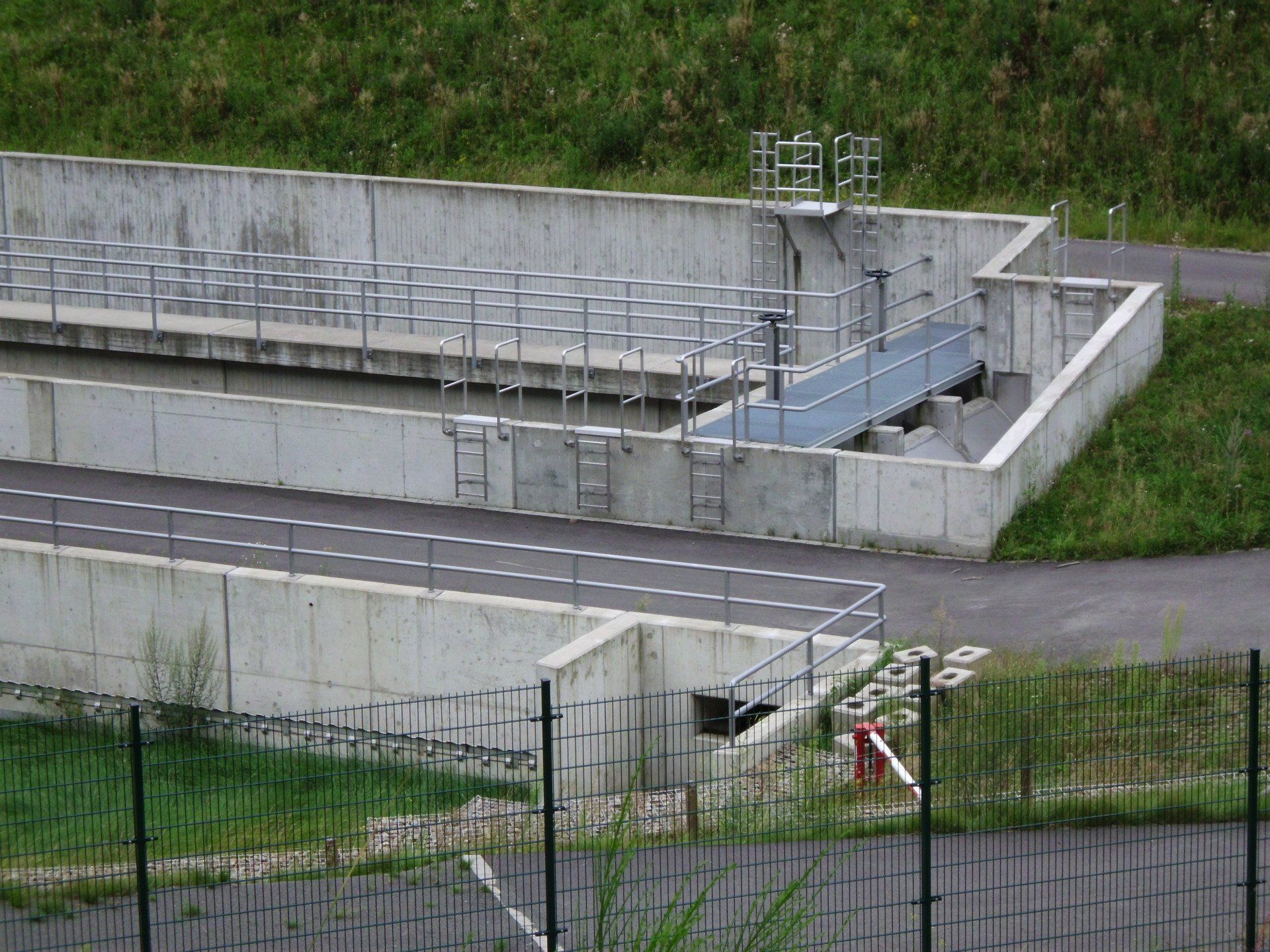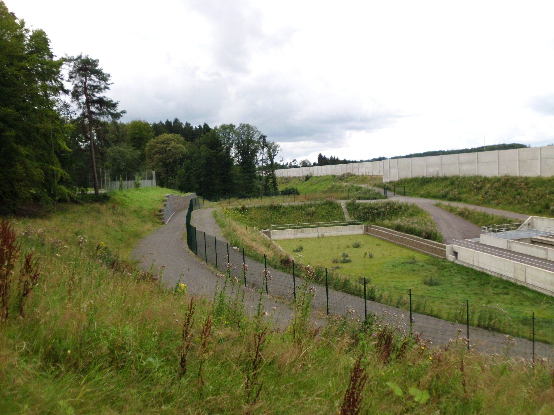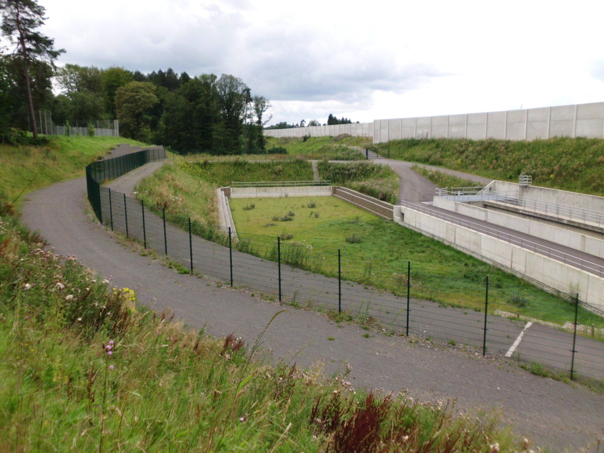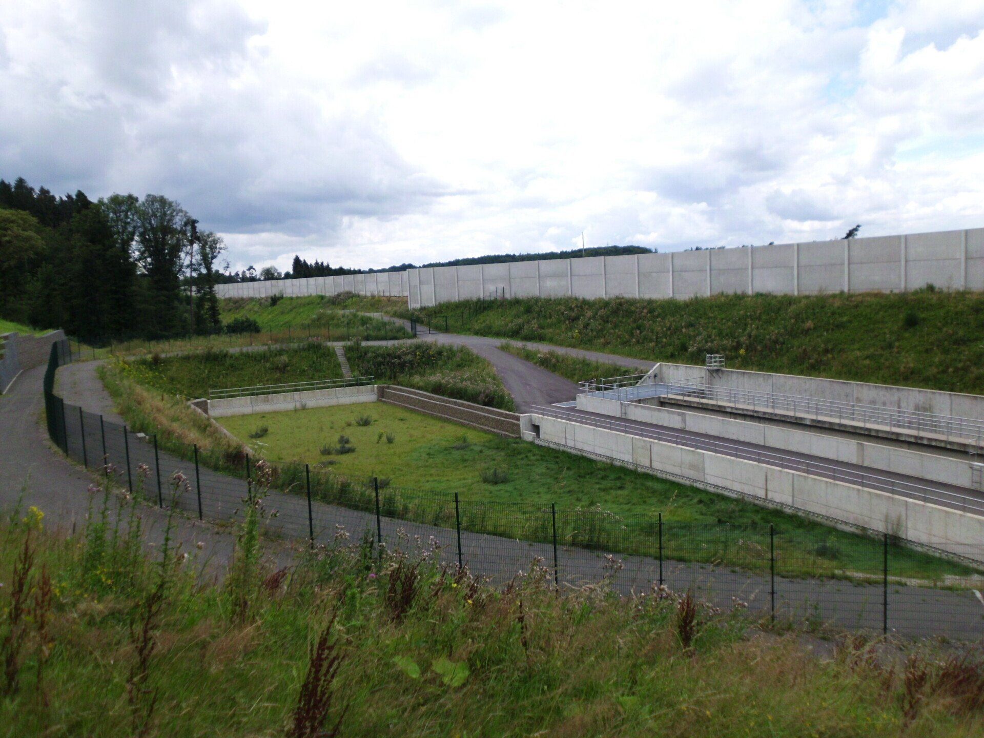Entscheidungsgründe für die Auswahl der Ausführungsvariante waren z.B. der erforderliche Platzbedarf für die Kombinationsanlage, die Möglichkeit zur Reinigung einer Beckenkammer bei ungehindertem Betrieb der zweiten Kammer, die Minimierung von Außenwänden, Trenn- und Vereinigungsbauwerken sowie Notentlastungsanlagen. Die SALbesteht aus einem Stahlbetonabscheider (RiStWag) und einem Bodenretentionsfilterbecken (BFB) als Erdbecken. Die gesamte Anlage wird durch umlaufende Wartungswege über eine zentrale Zufahrt vom aufgeweiteten Standstreifen der BAB aus erschlossen.