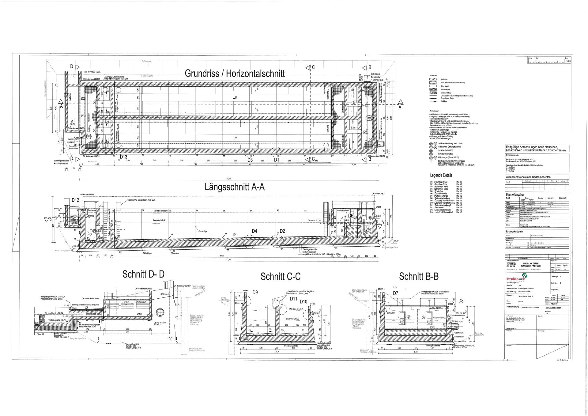 Entscheidungsgründe für die Auswahl der Ausführungsvariante waren z.B. der erforderliche Platzbedarf für die Kombinationsanlage, die Möglichkeit zur Reinigung einer Beckenkammer bei ungehindertem Betrieb der zweiten Kammer, die Minimierung von Außenwänden, Trenn- und Vereinigungsbauwerken sowie Notentlastungsanlagen. Die SALbesteht aus einem Stahlbetonabscheider (RiStWag) und einem Bodenretentionsfilterbecken (BFB) als Erdbecken. Die gesamte Anlage wird durch umlaufende Wartungswege über eine zentrale Zufahrt vom aufgeweiteten Standstreifen der BAB aus erschlossen.