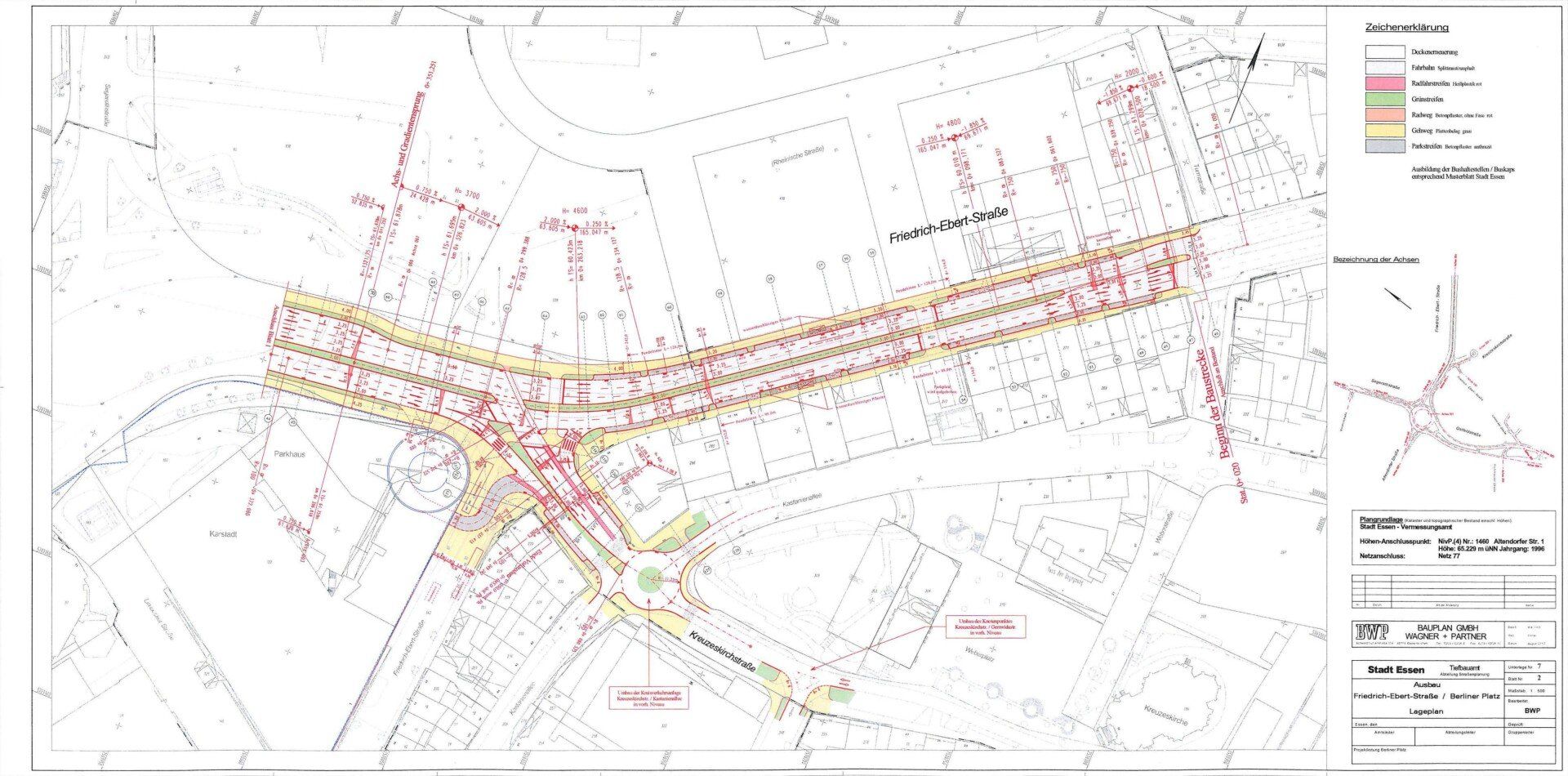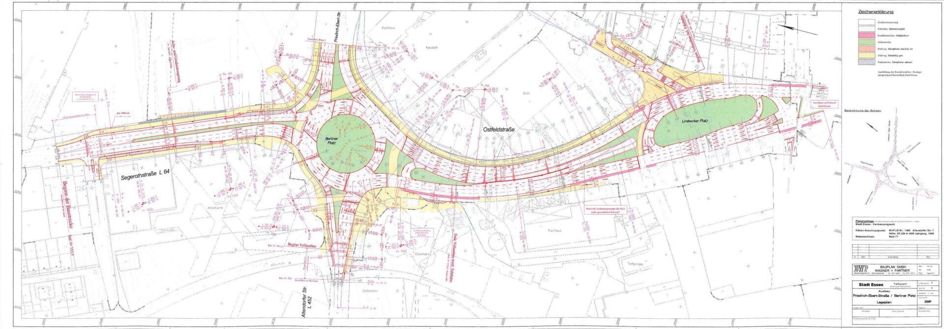 Mit Umbau des vorhandenen Knotenpunktes zu einer signalgeregelten Kreisverkehrsanlage wurden die Anschlussstraßen hinsichtlich ihres Straßenquerschnitts neu geregelt. Bei der Höhenplanung wurde ein besonderes Augenmerk auf die Einhaltung der Bestandshöhen an den äußeren Straßenbegrenzungslinien, zum projektierten Einkaufzentrum "Limbecker Platz" und zu den vorhandenen ÖPNV-Ausgänge der städtischen U-Bahn berücksichtigt.